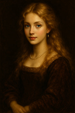 Adorn your walls with the exquisite beauty of this digital masterpiece, a portrait that flawlessly blends historical elegance with a timeless, serene presence. This artwork features a captivating young woman with striking blue eyes that hold a gentle, yet profound gaze. Her luscious, golden-blonde hair cascades around her, beautifully complemented by a delicate pearl earring and a classic pearl necklace that shimmer against her rich, dark gown. The deep, moody background enhances her luminous features, creating an aura of classic sophistication and quiet allure.