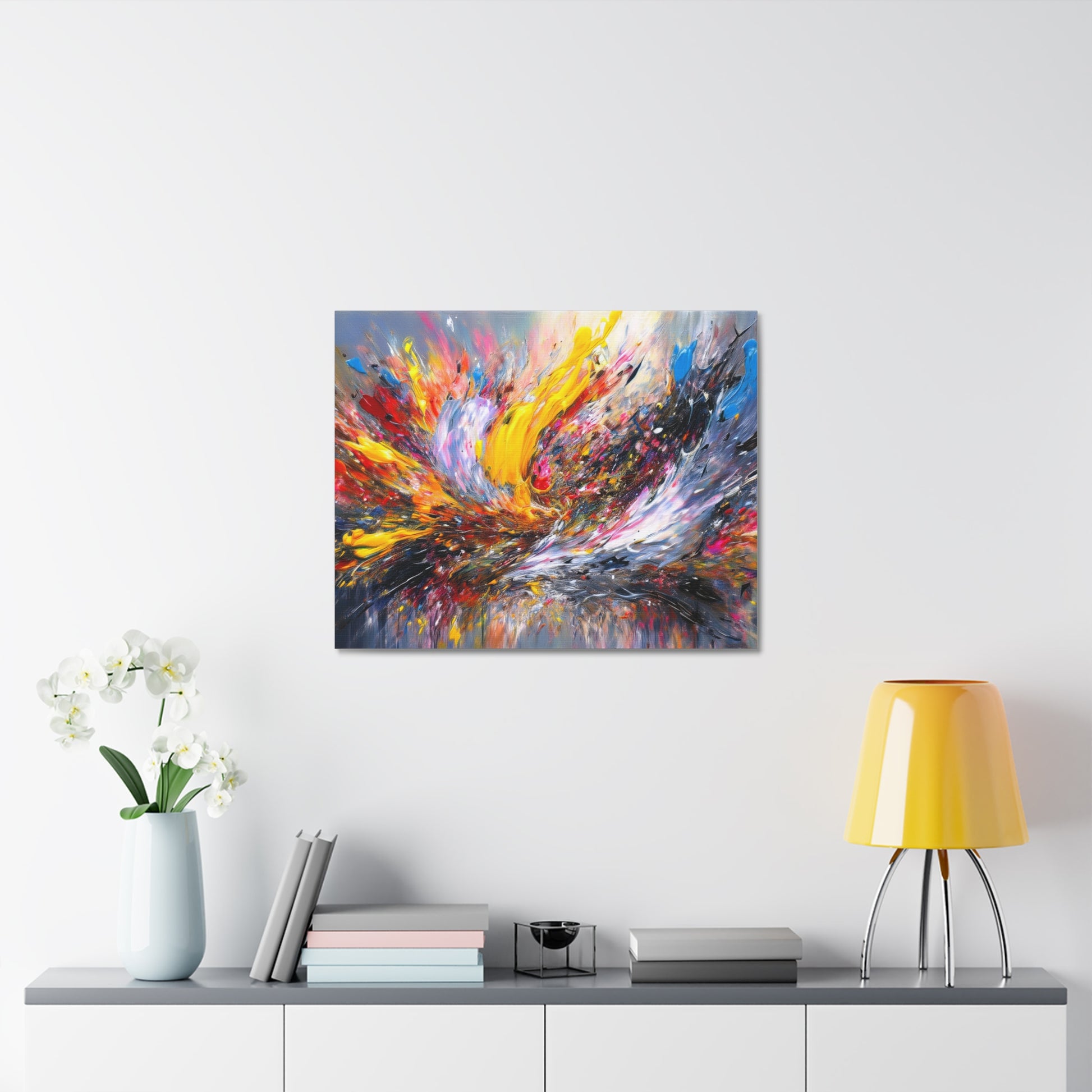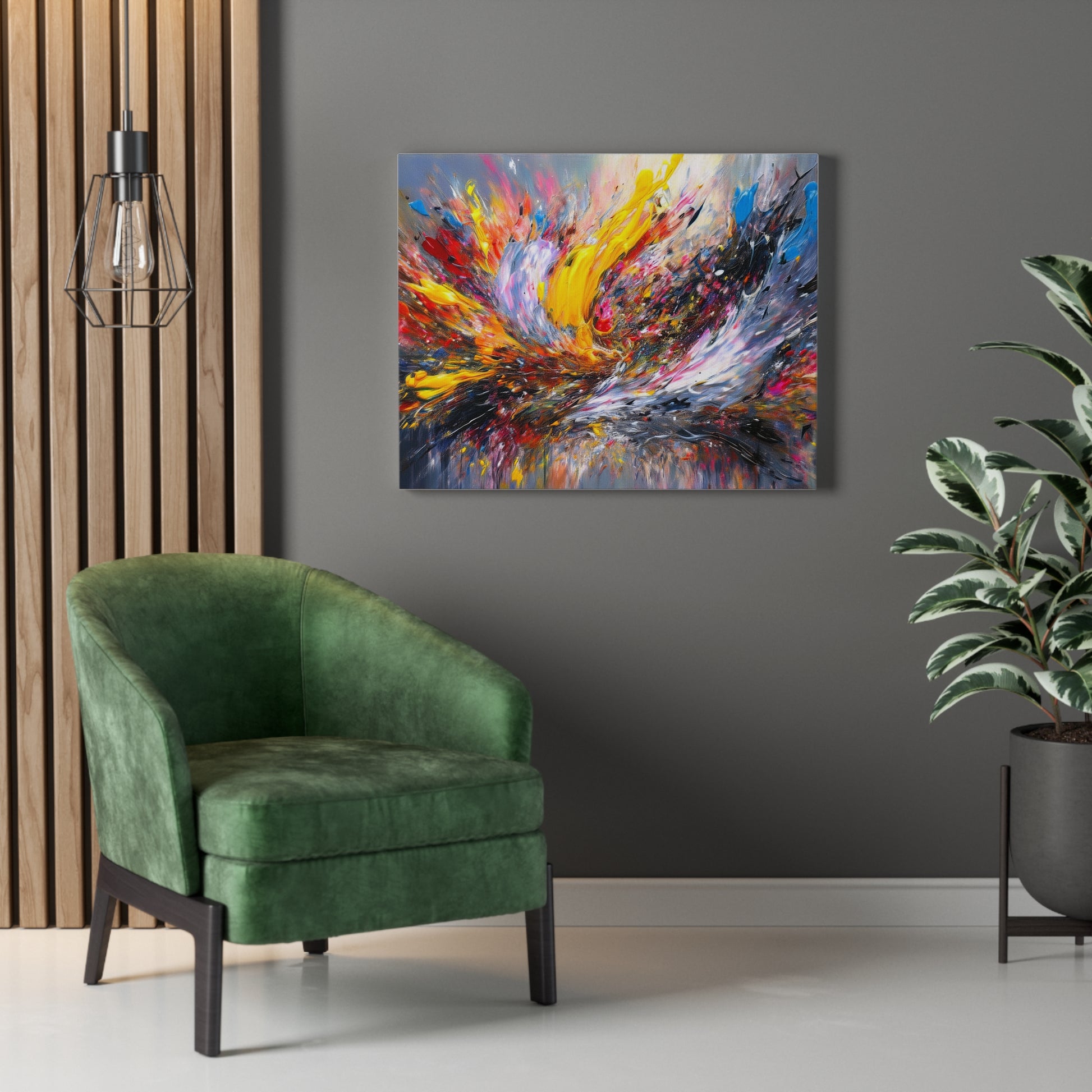 This dynamic abstract piece explodes with a vibrant spectrum of colors, swirling and bursting forth from a central point. It evokes a feeling of exhilarating movement, raw emotion, and unbridled creativity, capturing a fleeting moment of pure artistic liberation.