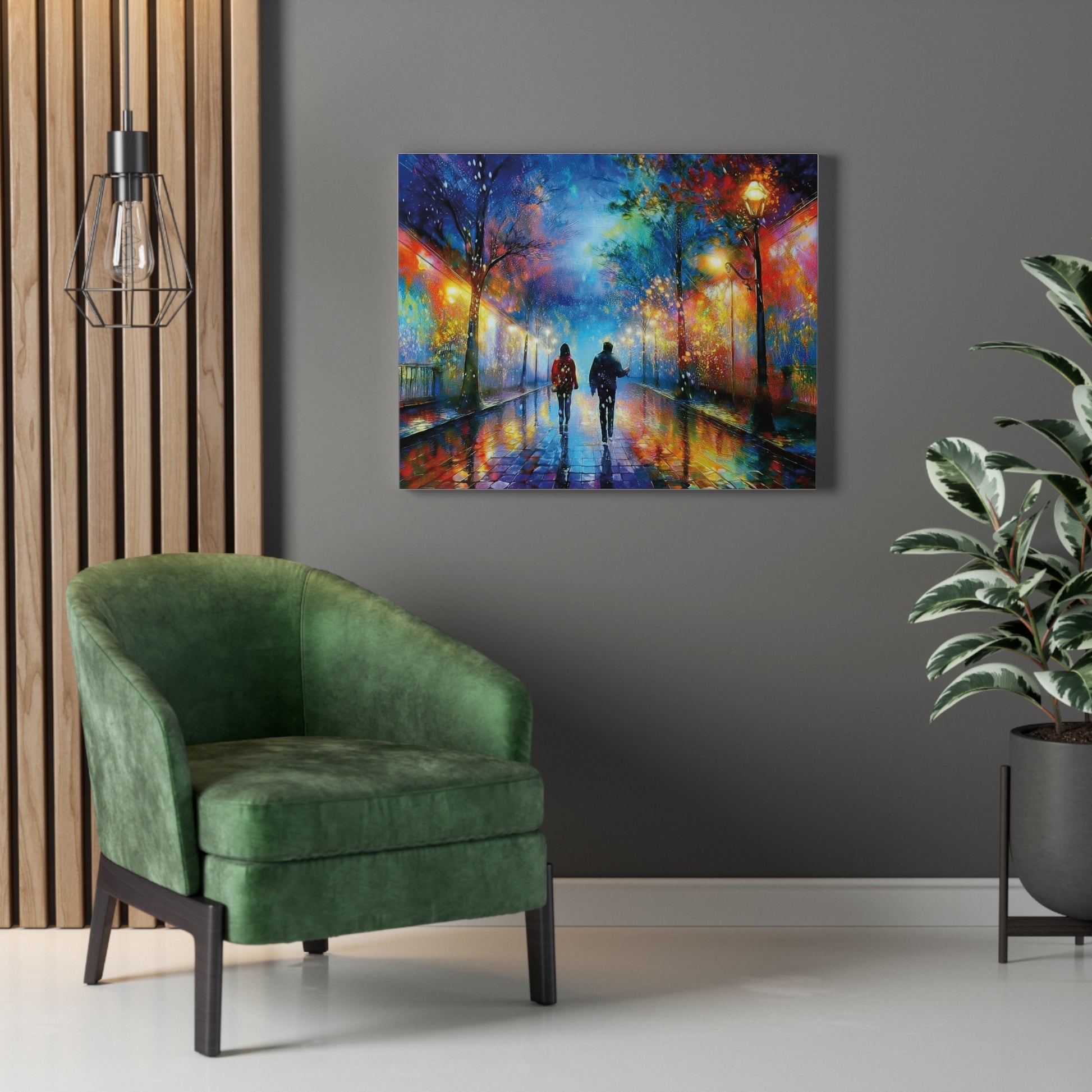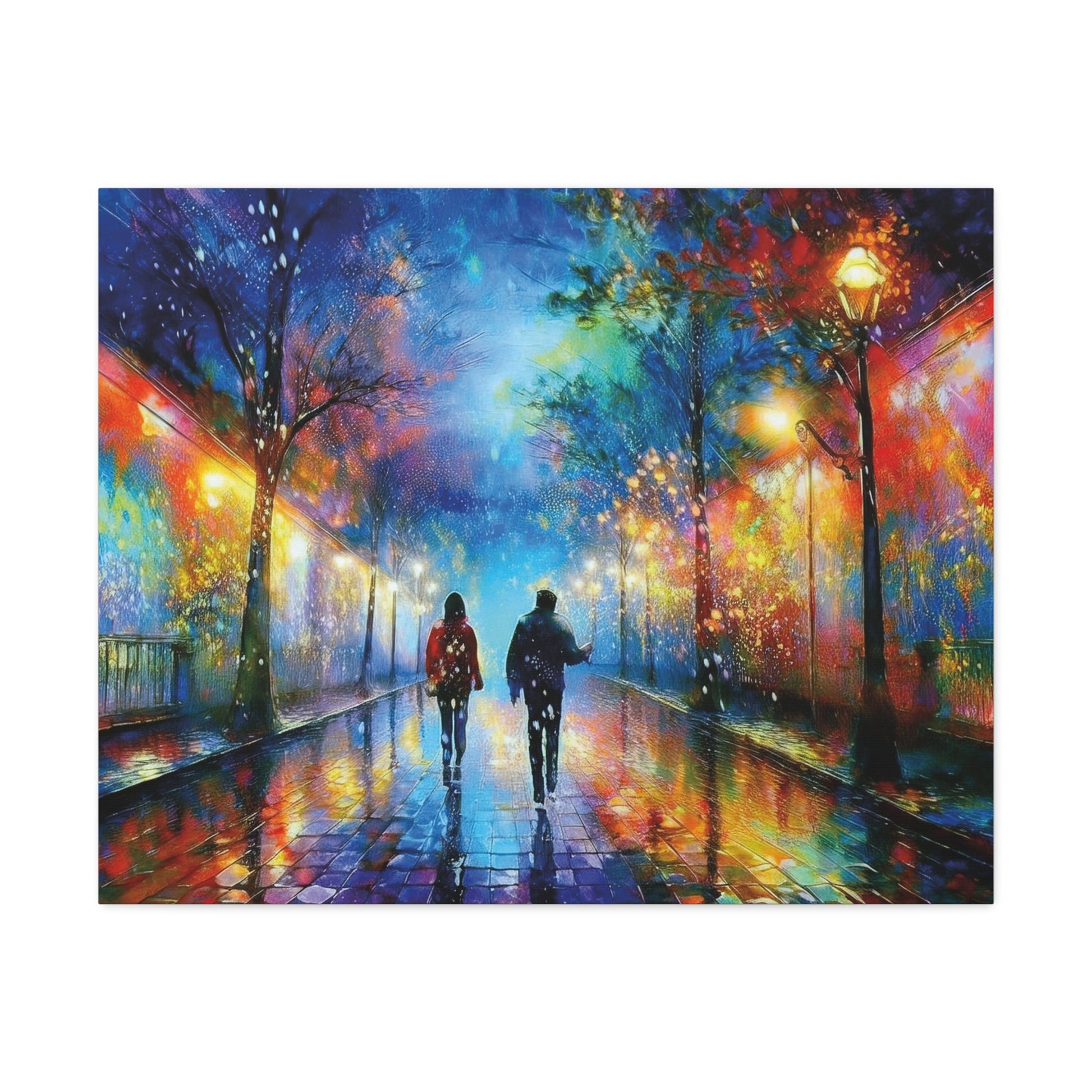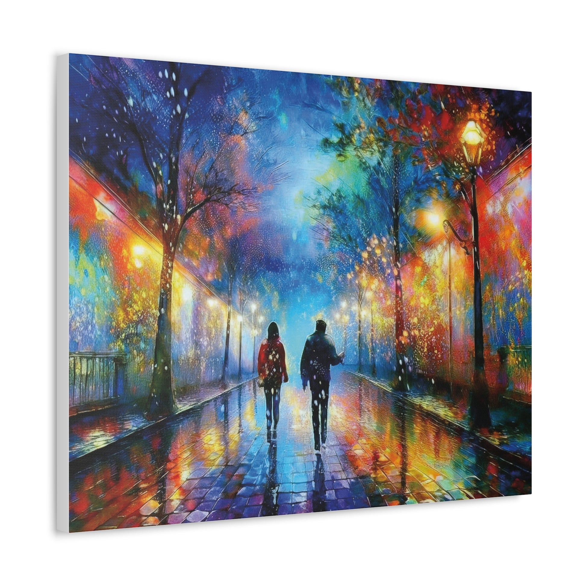 Capture the romantic atmosphere of a couple walking in city lights with this stunning canvas print. Perfect for adding a touch of love and warmth to any room, this artwork is ideal for those who appreciate art and want to create a cozy ambiance in their space. Great for Valentine's Day, anniversaries, or as a special gift for a loved one.