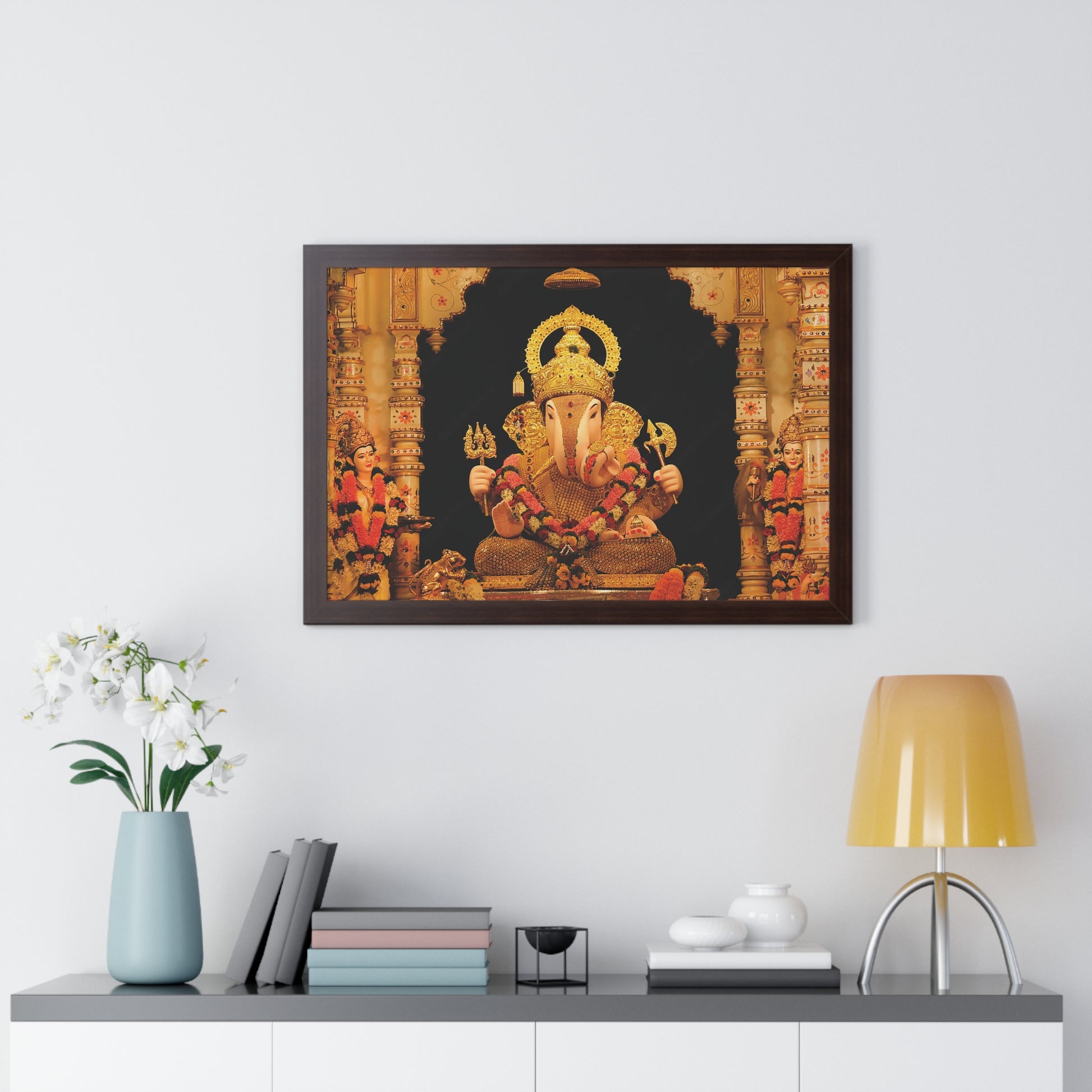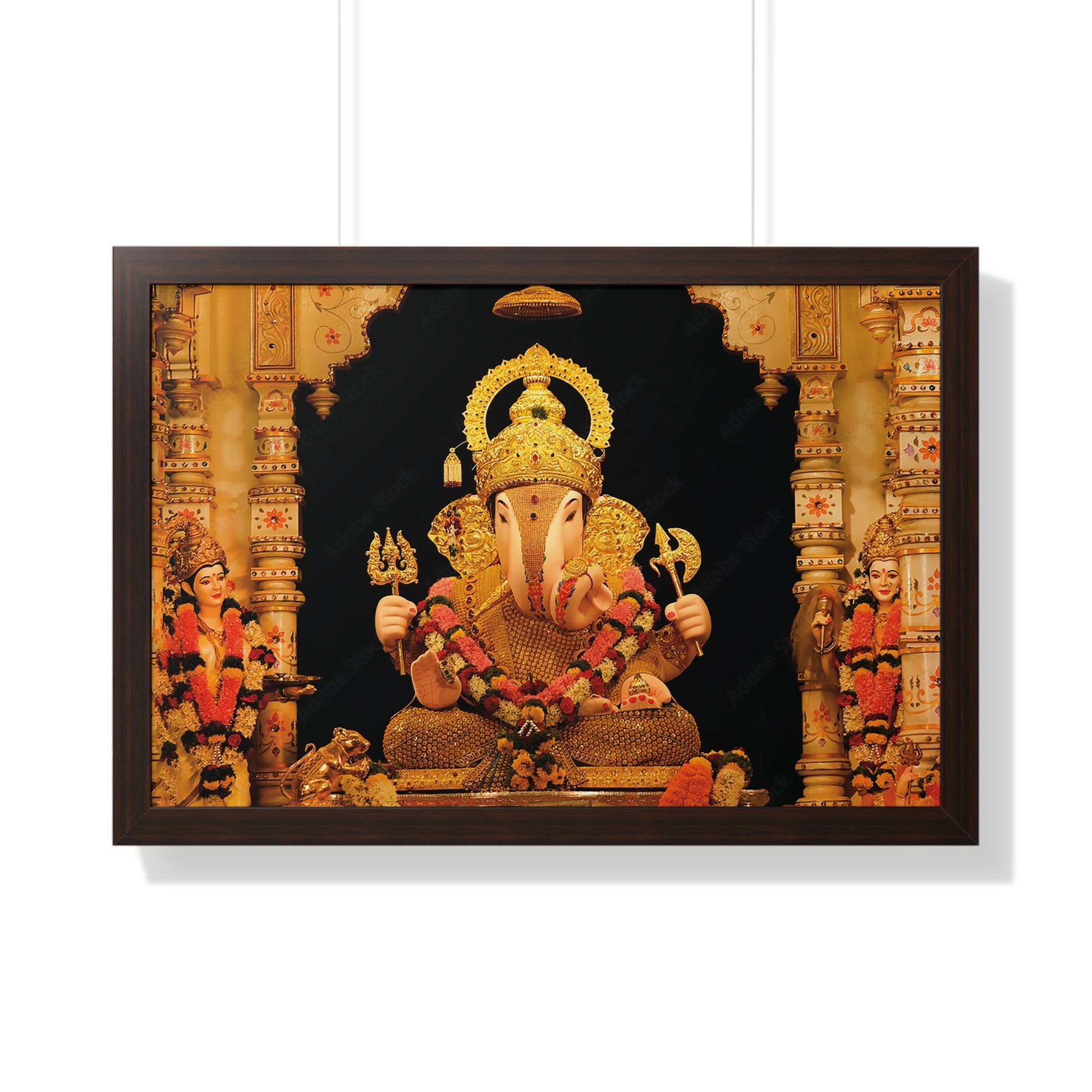 A stunning framed horizontal poster featuring Lord Ganesha, perfect for adding a touch of spirituality to any space. This poster gives a warm and peaceful vibe, making it ideal for meditation rooms or spiritual decor enthusiasts. Relevant for spiritual holidays, celebrations, and occasions such as Diwali and Ganesh Chaturthi.