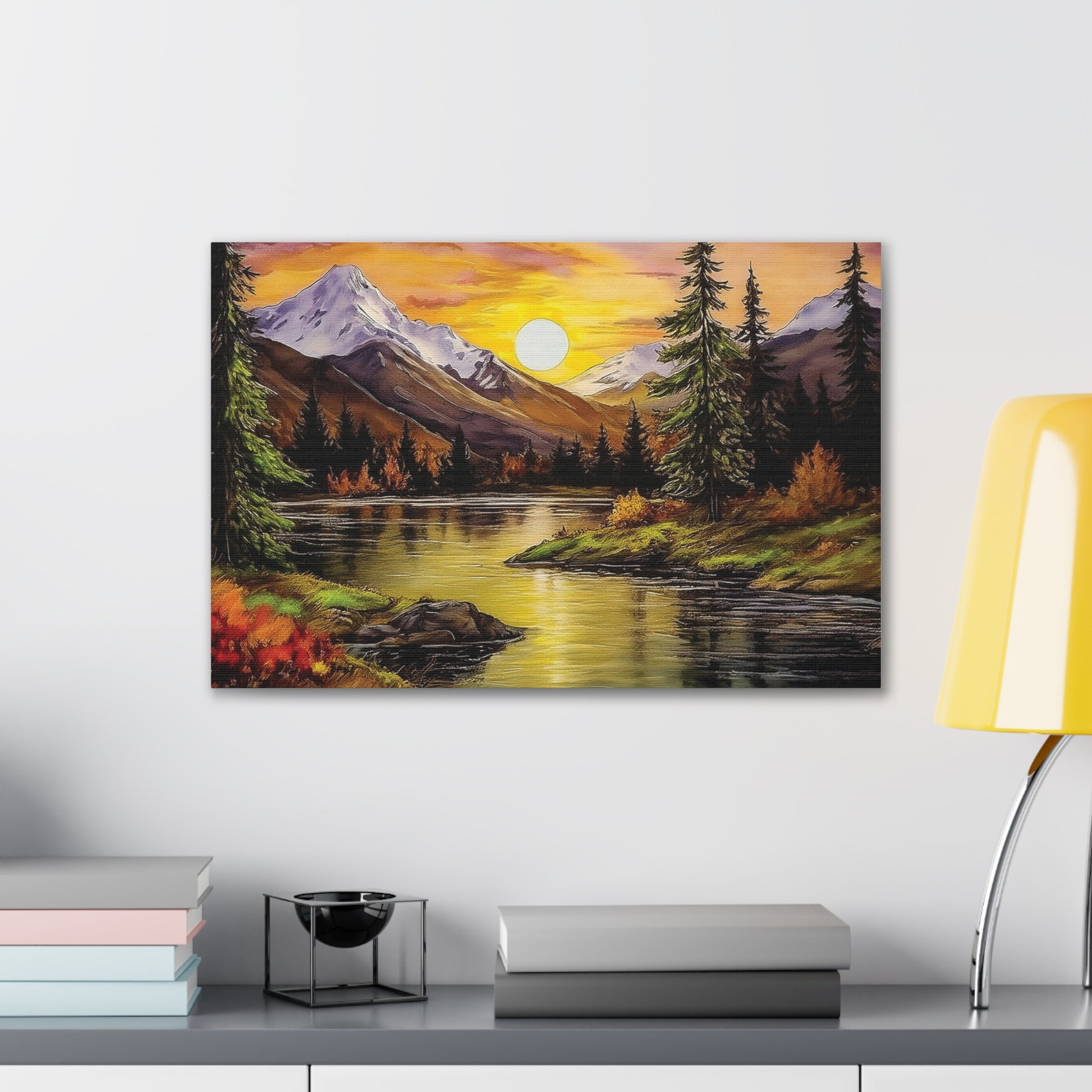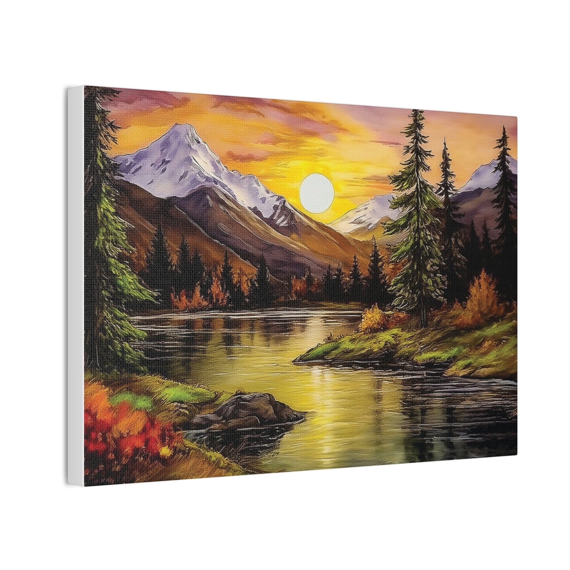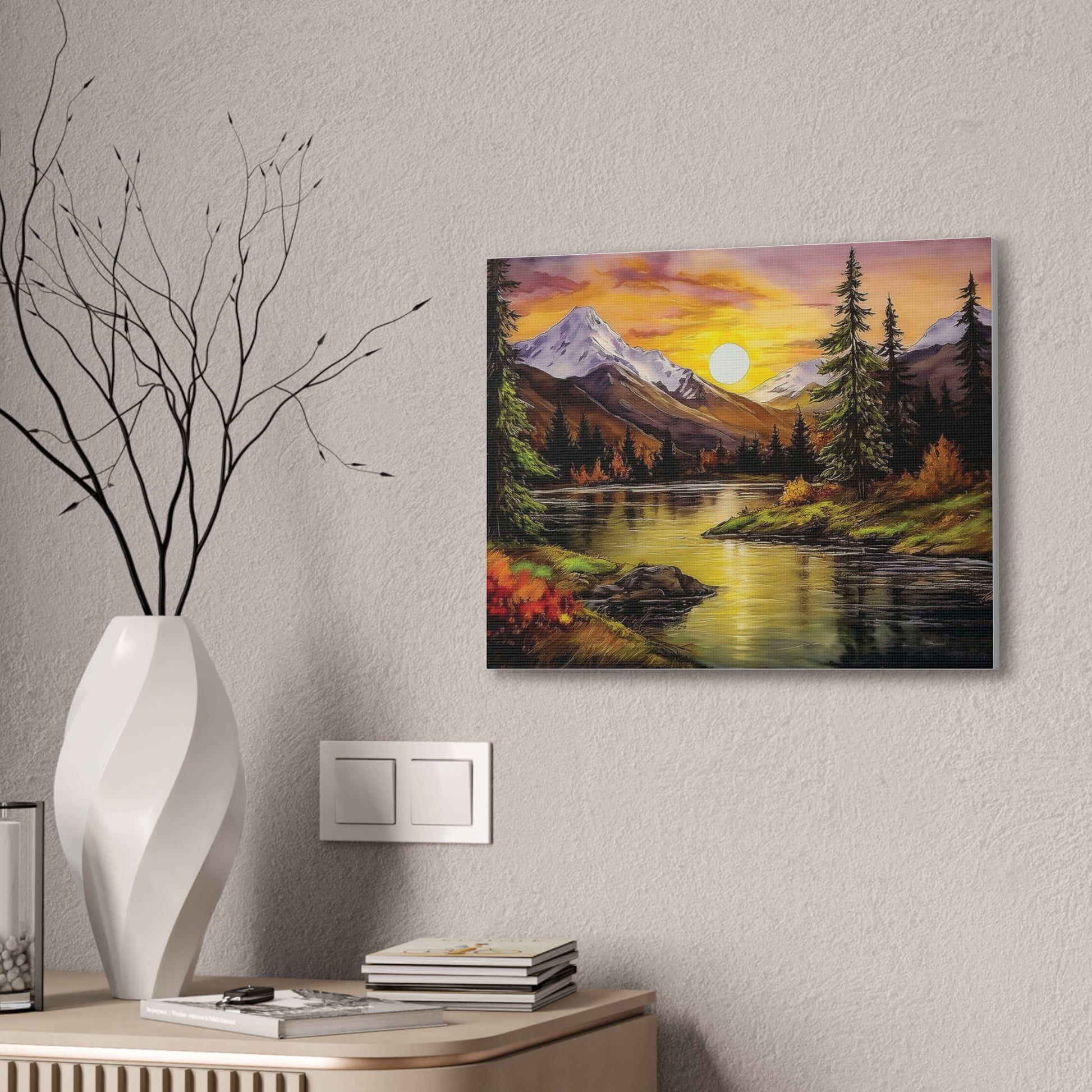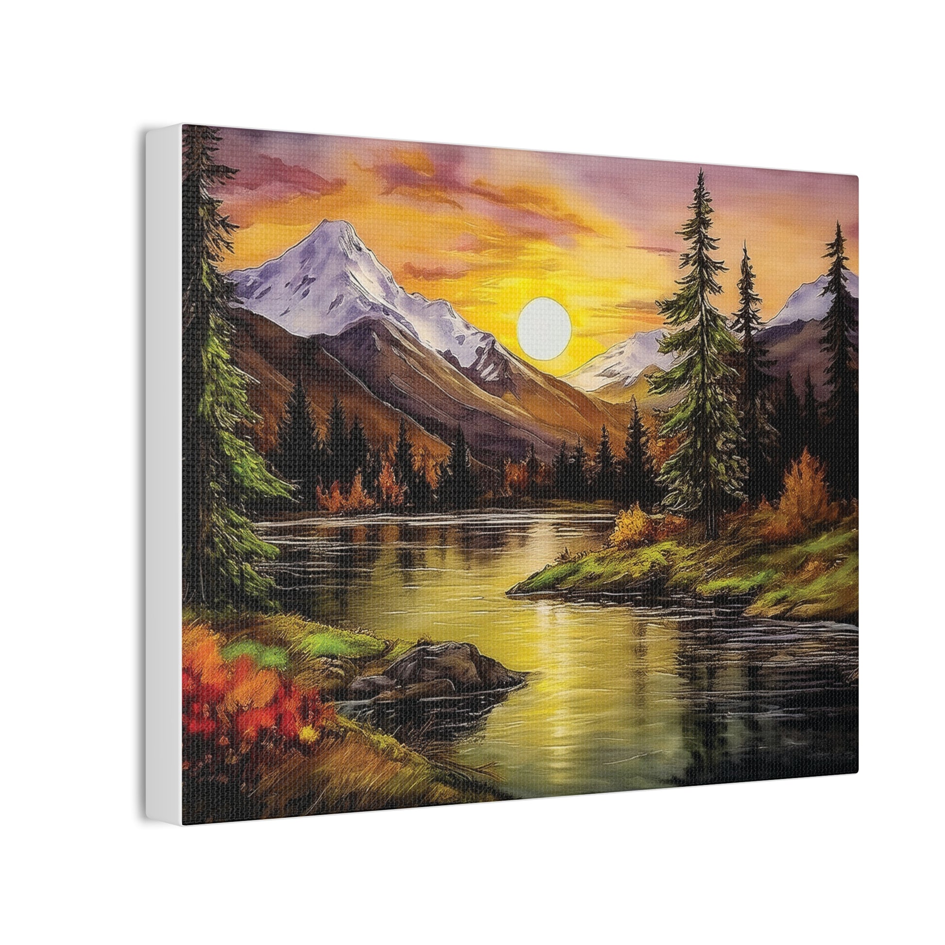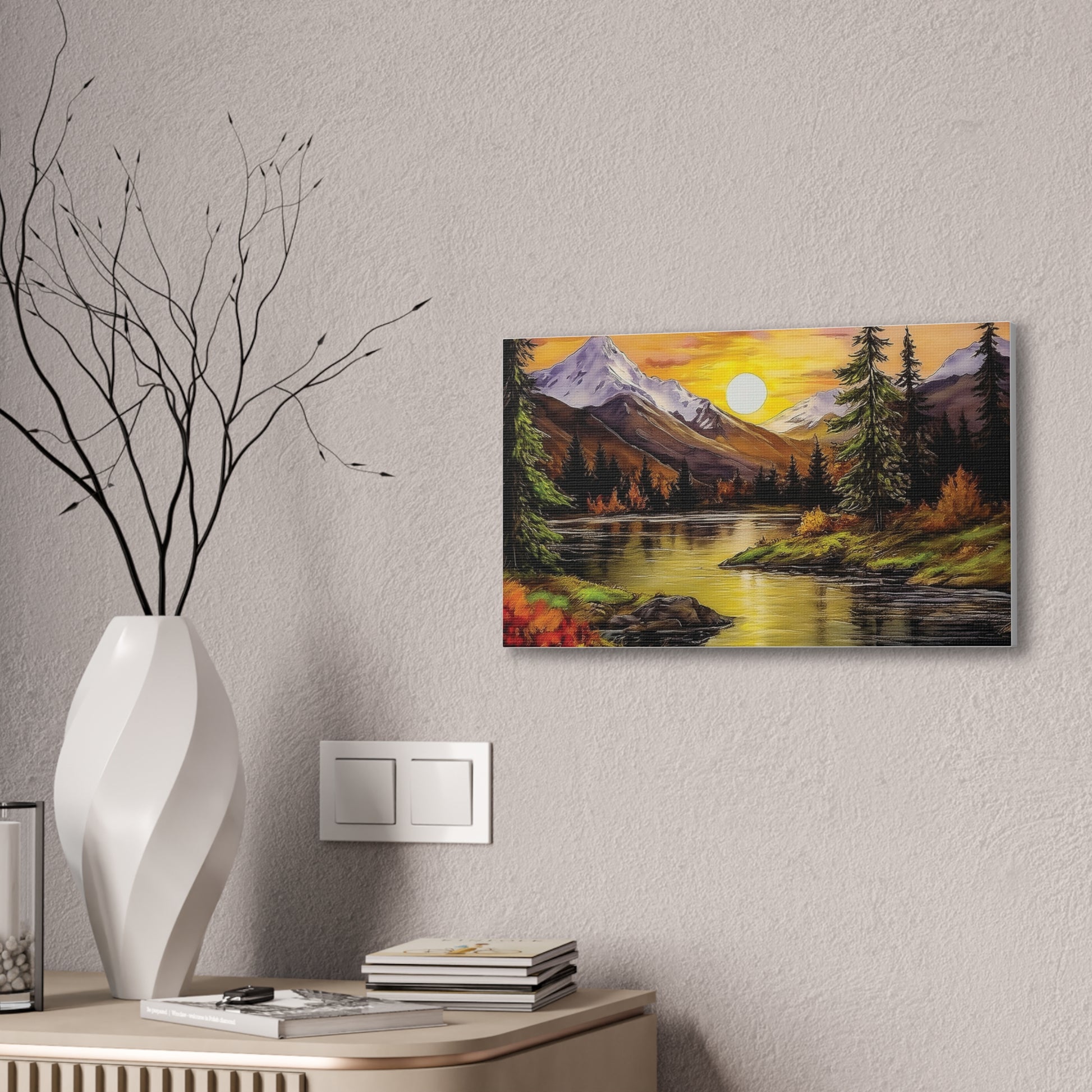 Transform your living space with this stunning canvas print. This captivating piece showcases a serene sunset scene, complete with majestic mountains and a peaceful river. Its vibrant colors bring life to any room, creating an uplifting atmosphere that invites relaxation and reflection. Perfect for nature lovers and anyone looking to enhance their home décor, this canvas print fits seamlessly into various settings—be it the living room, bedroom, or office. Ideal for holidays, housewarming gifts, or just as a special treat for yourself, it's a versatile addition that brightens up celebrations and everyday moments alike. Elevate your surroundings with art that inspires calm and connection with nature.