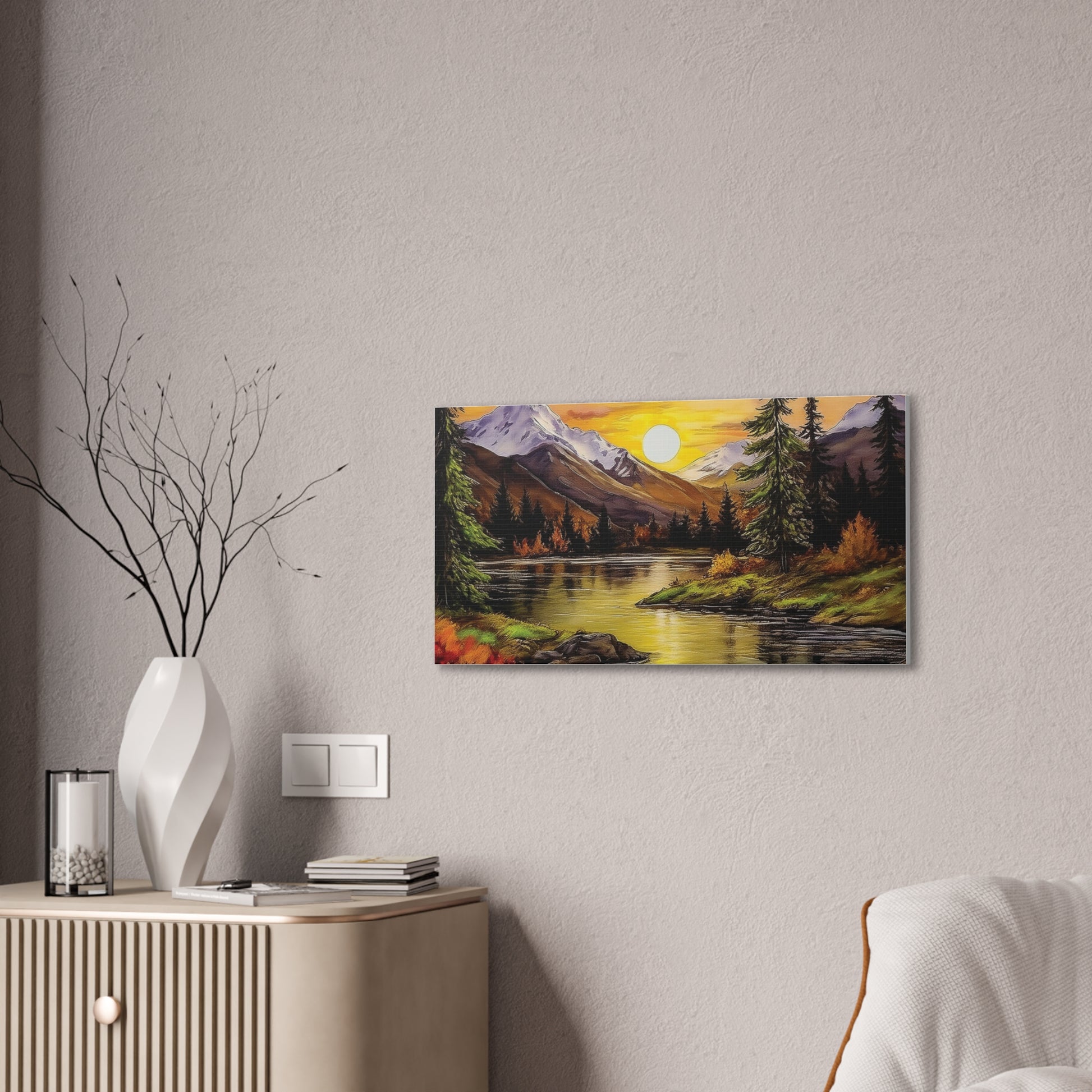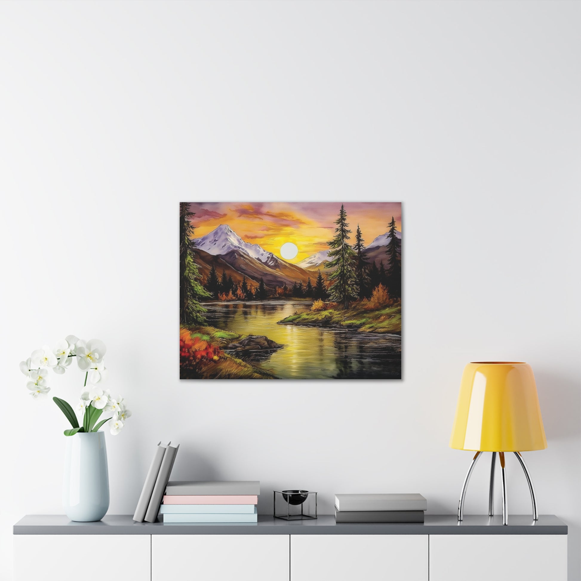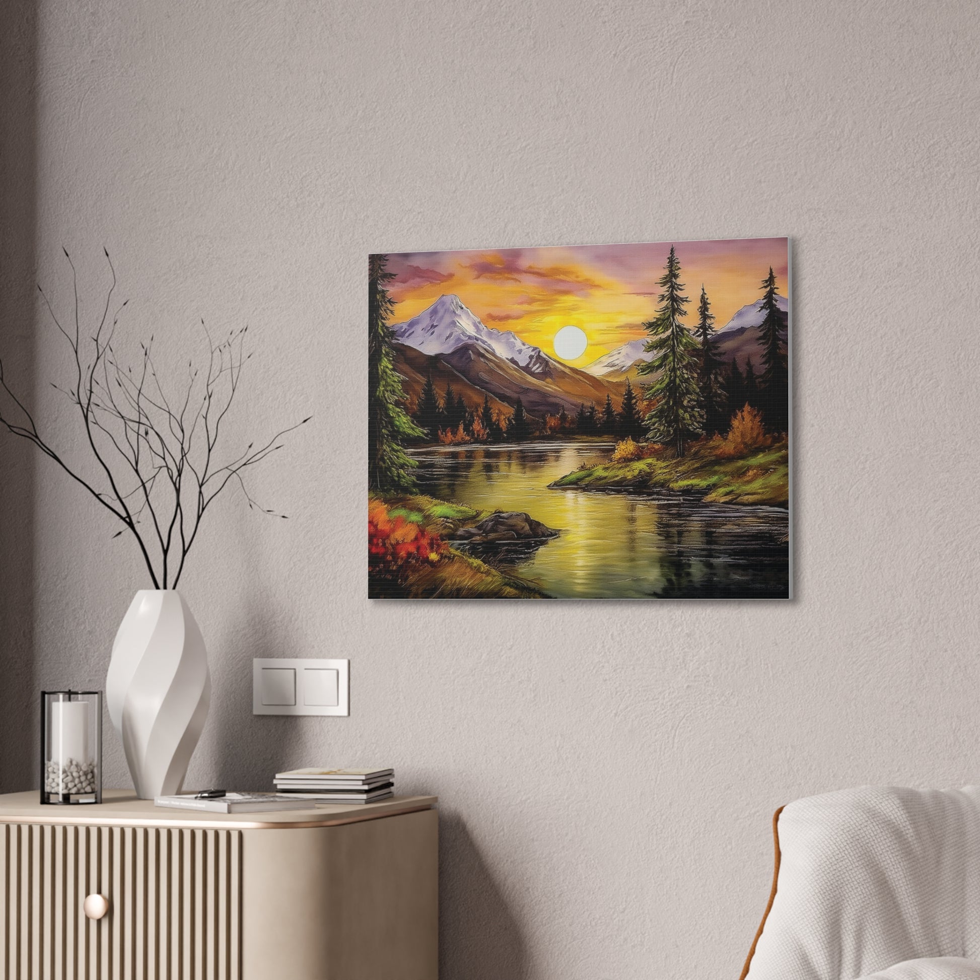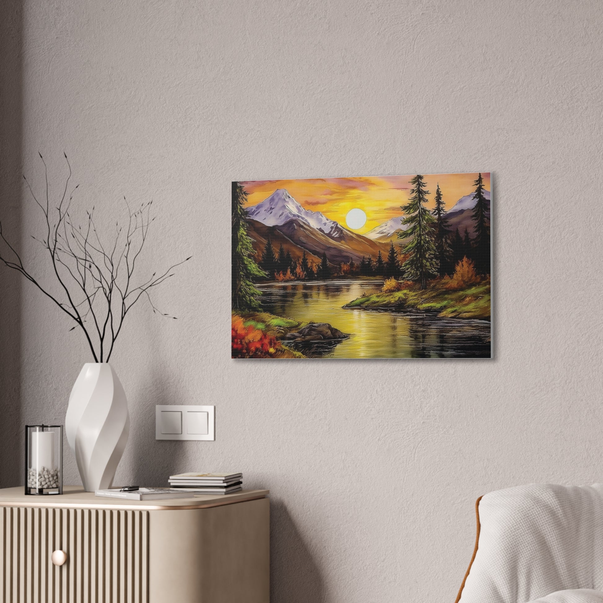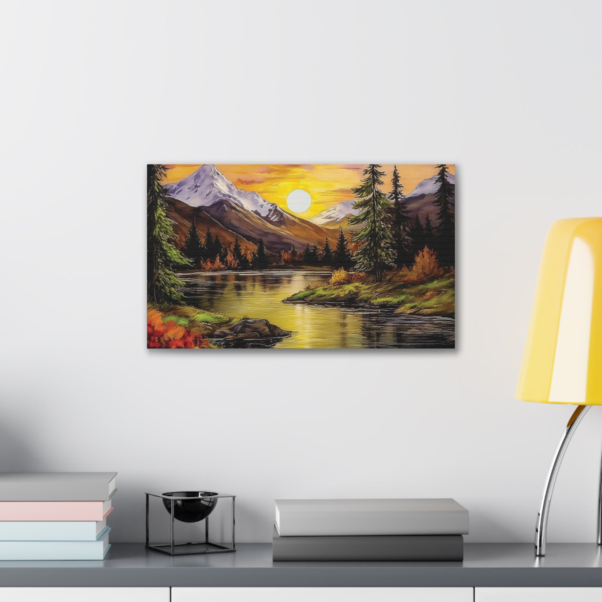 Transform your living space with this stunning canvas print. This captivating piece showcases a serene sunset scene, complete with majestic mountains and a peaceful river. Its vibrant colors bring life to any room, creating an uplifting atmosphere that invites relaxation and reflection. Perfect for nature lovers and anyone looking to enhance their home décor, this canvas print fits seamlessly into various settings—be it the living room, bedroom, or office. Ideal for holidays, housewarming gifts, or just as a special treat for yourself, it's a versatile addition that brightens up celebrations and everyday moments alike. Elevate your surroundings with art that inspires calm and connection with nature.