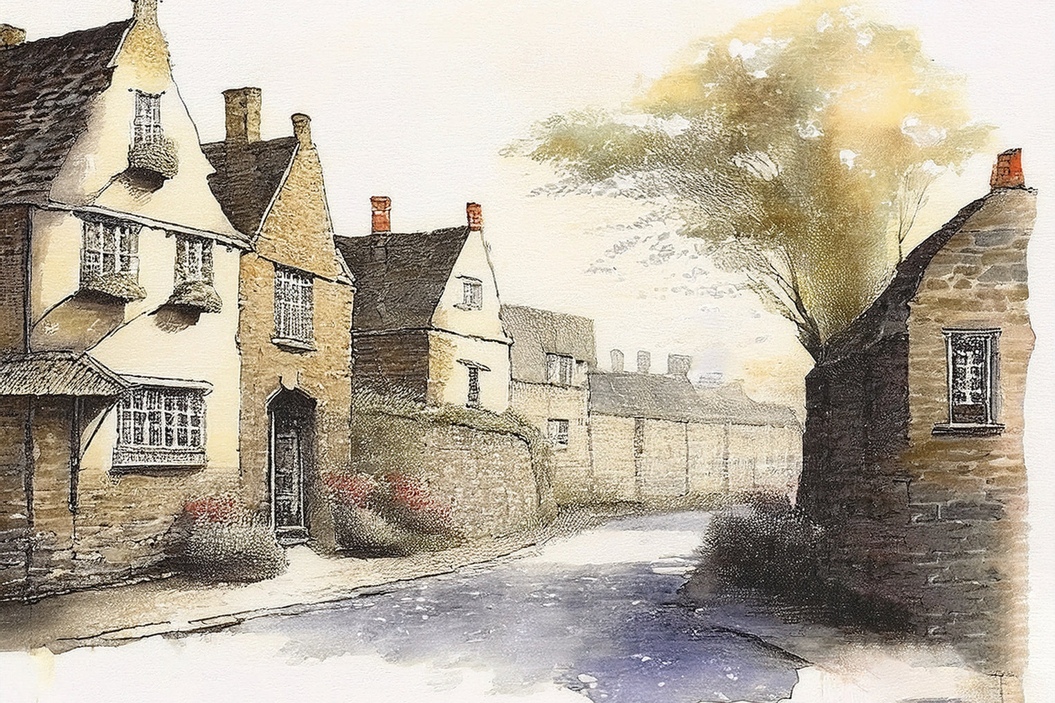 A stunning original Artwork blending the precision of pen-and-ink with the ethereal quality of watercolor, capturing a beautiful, timeless street in the English Cotswolds.