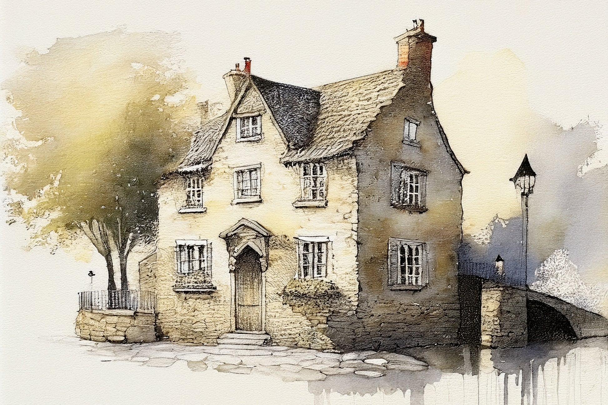 This is an original mixed-media artwork that captures the soulful solitude of an iconic stone cottage. The piece features a classic, gabled European-style house rendered in a charming fusion of detailed pen-and-ink sketching and soft, ethereal watercolor washes.