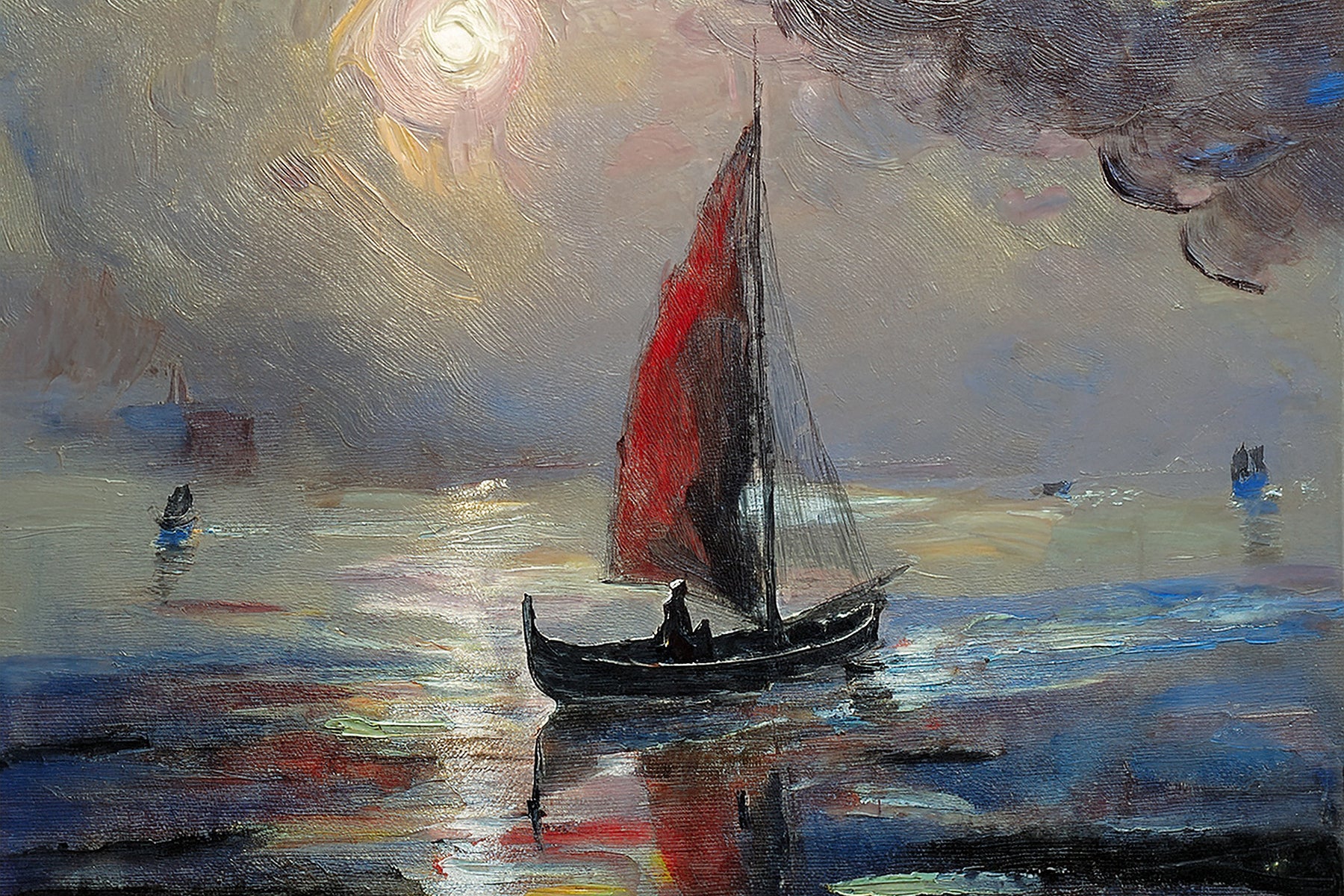 "Awaken your senses with 'Whispers of the Tide,' a captivating oil painting that beautifully captures the serene start or end of a day on the water. This enchanting piece features a lone vessel, its single crimson sail a vibrant beacon against the soft, diffused light of a rising or setting sun. The rich, textured brushwork creates a lively play of color on the water's surface, reflecting the dramatic sky and the distant hints of other boats. This artwork evokes a feeling of peaceful solitude and the timeless rhythm of the sea.